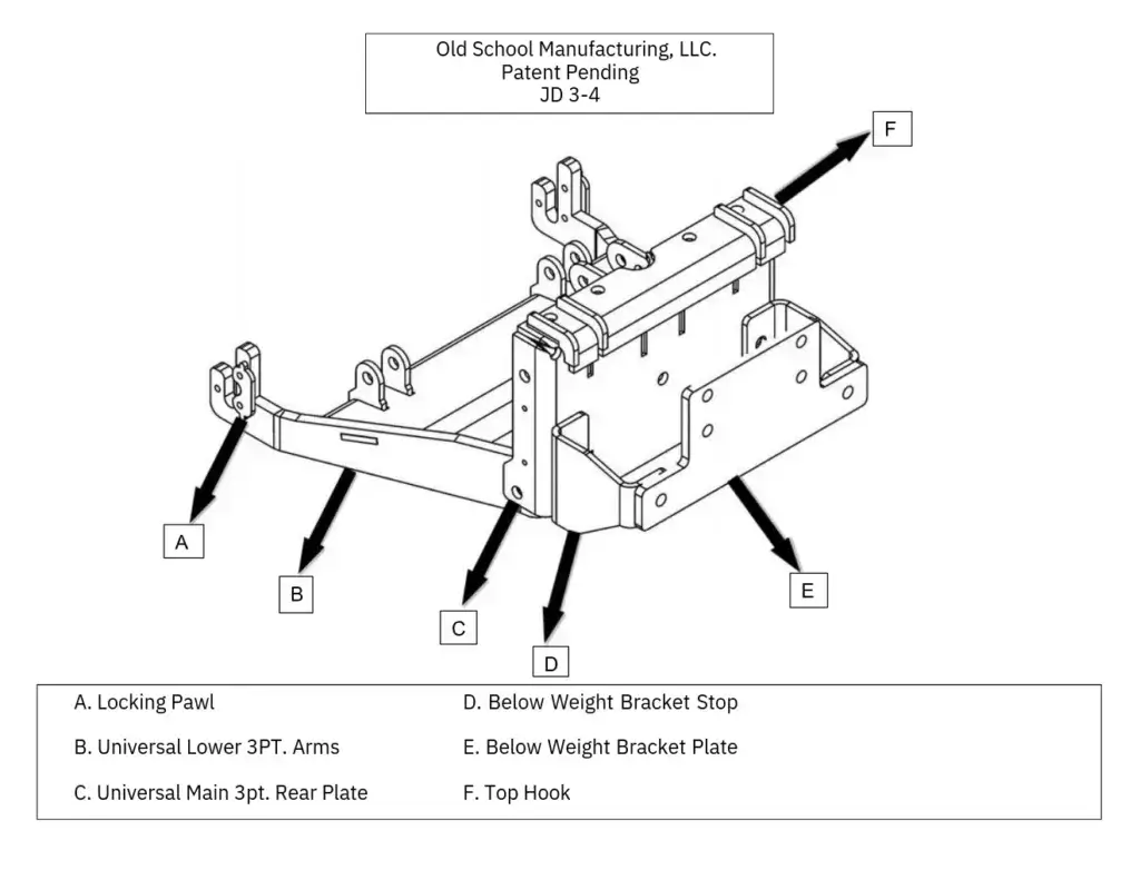 Platzieren Sie den oberen Haken (F) locker auf der universellen 3-Punkt-Hauptrückplatte (C) (lassen Sie etwa 1,27 cm Abstand).