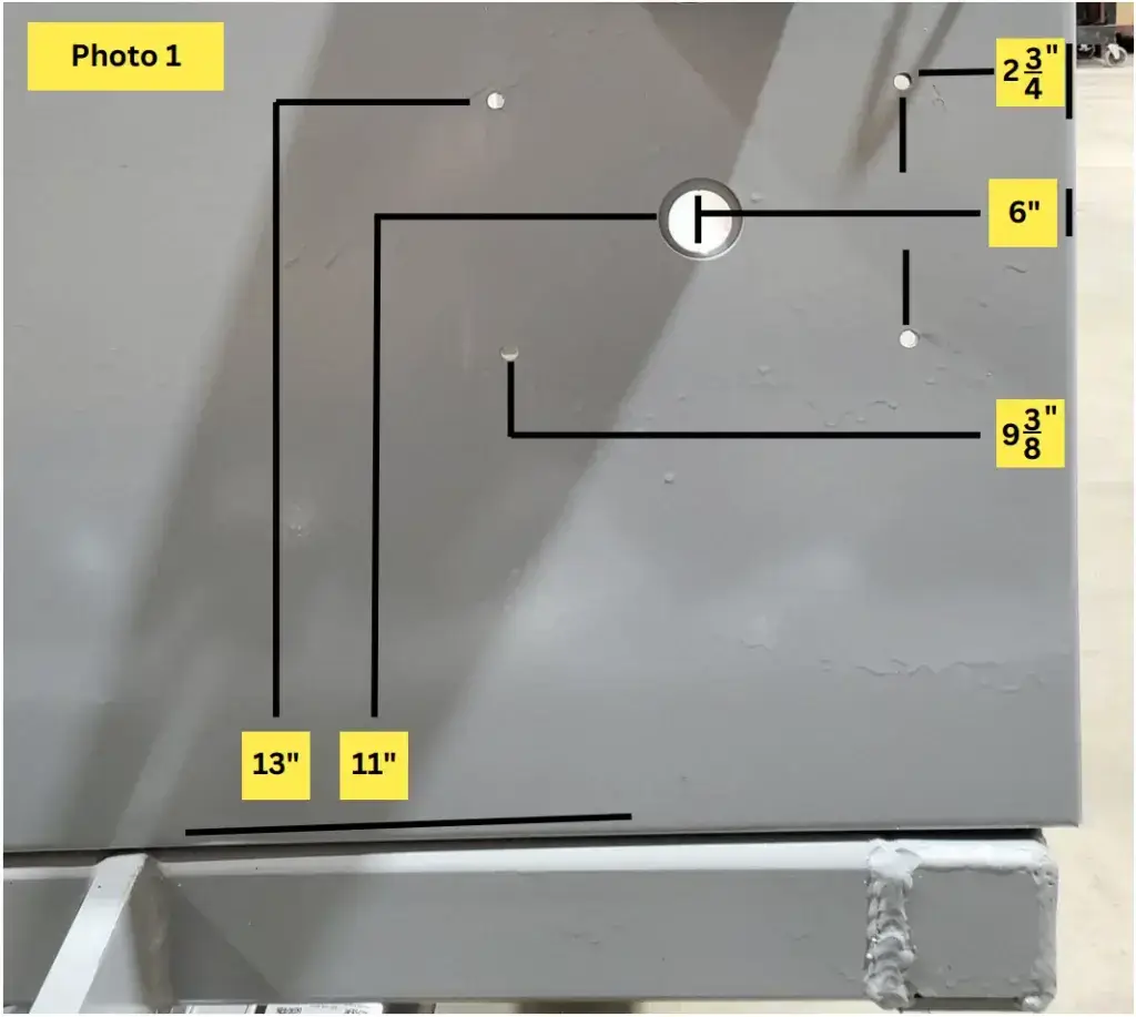 Messen Sie 11″ von der unteren Rückleitung und 6″ über die Mitte in der unteren rechten hinteren Ecke des Wagens. Platzieren Sie eine Markierung.