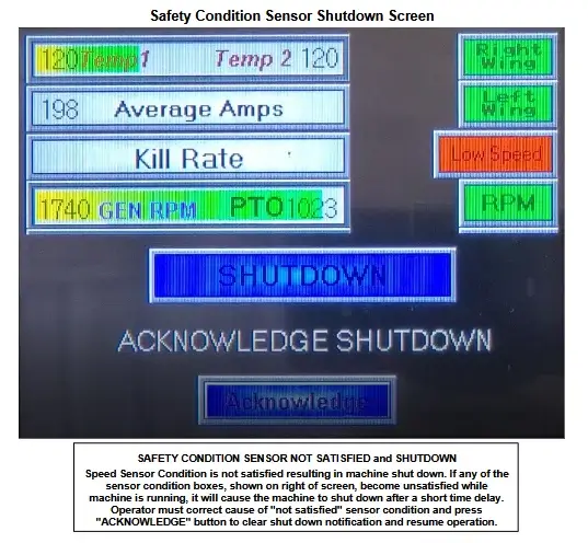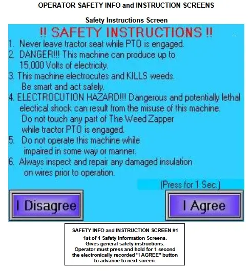 Der Kontrollmonitor des Weed Zapper informiert den Bediener über Leistung der Maschine. Der Bildschirm sollte vom Bediener genau beobachtet werden während der Weed Zapper in Betrieb ist. Der Monitor sollte für den Bediener leicht erreichbar sein um notwendige Anpassungen vorzunehmen und den Weed Zapper bei Bedarf schnell zu stoppen.