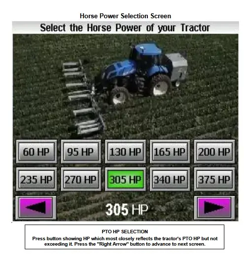 Auf dem Monitorbildschirm werden verschiedene Leistungseinstellungen angezeigt. Da es sich hierbei um ungefähre Angaben handelt, Wählen Sie in den Einstellungen die angezeigte PS-Zahl aus, die der Zapfwellenleistung Ihres Traktors am nächsten kommt.